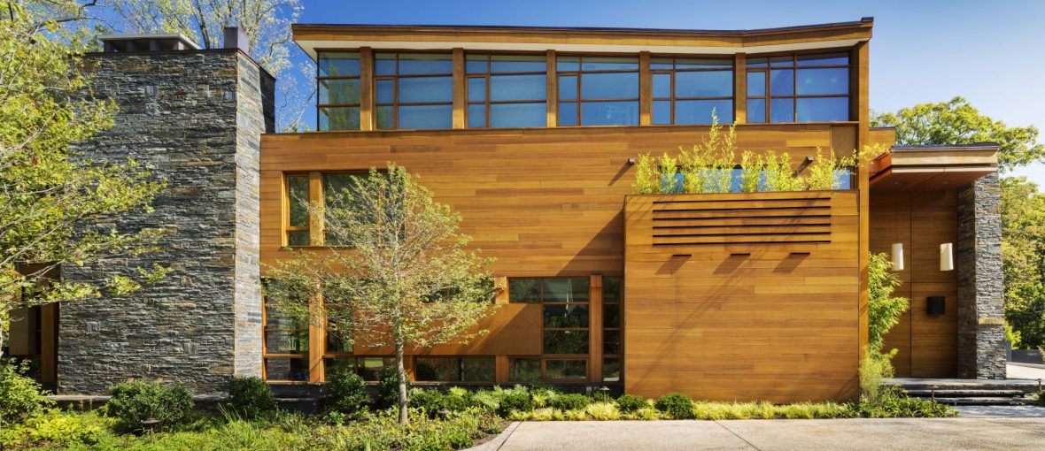 The Chalon Drive home integrates building and landscape that embodies the core elements of modernism. Its flat roofs and custom stained mahogany exterior make a bold statement next to the traditional neighboring houses. The ground floor is predominantly floor to ceiling glass.