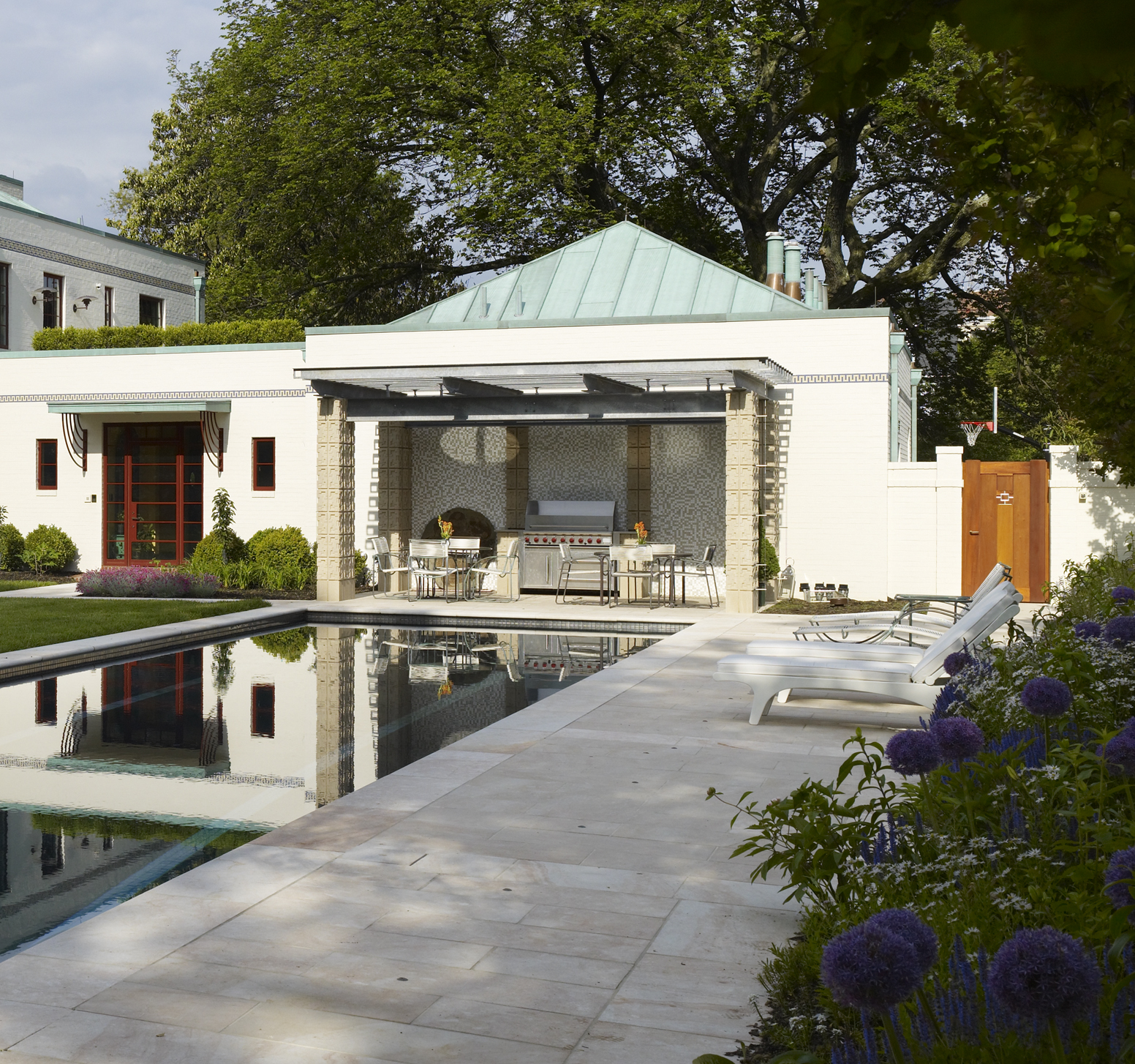 The owner requested to maintain the unimposing nature and style of the original home while expanding the space to meeting their family's needs. To accomplish this, we used a pre-patinated copper roof to preserve the home’s weathered identity. Inside, we updated the basement addition with an entertainment area and subterranean squash court. This 35-foot excavation required 600 truckloads of soil removal from the site.