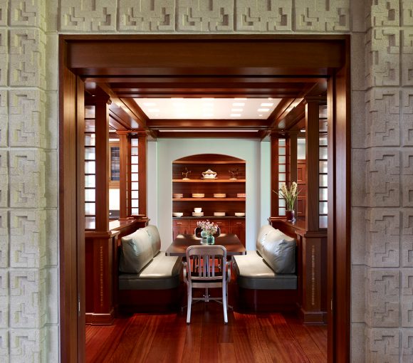 While the exterior of this home may seem unimposing, the inside boasts a Frank Lloyd Wright-inspired great room with textured walls, grand staircases, and luxurious amenities. This addition and renovation was achieved in a strict 17-month timeline.